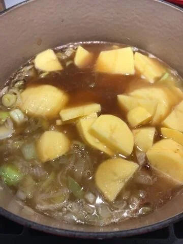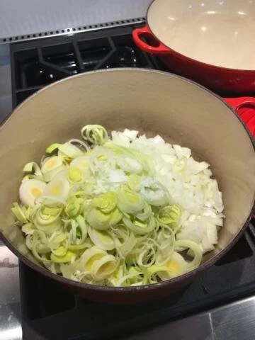 2 Melt fat/butter in now-empty saucepan over medium-low heat. When butter foams, stir in sliced leeks, onion, and 1 teaspoon salt. Reduce heat to low and cook, stirring frequently, until vegetables are softened, about 10 minutes.